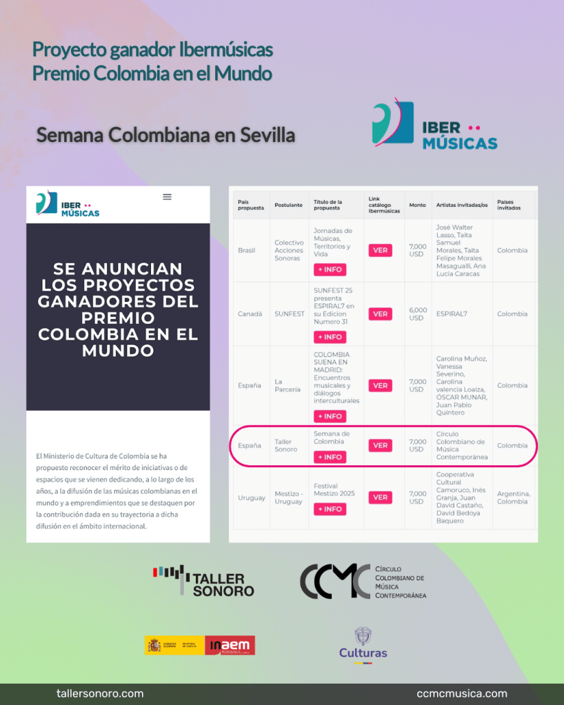 El Círculo Colombiano de Música Contemporánea invita a participar en la presente convocatoria para seleccionar obras que serán interpretadas por el ensamble Taller sonoro en diciembre del 2025 en la ciudad de Sevilla (España)