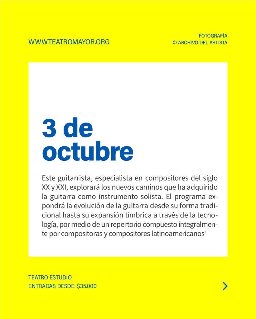 Este guitarrista, especialista en compositores del siglo XX y XXI, explorará los nuevos caminos que ha adquirido la guitarra como instrumento solista. El programa expondrá la evolución de la guitarra clásica desde su forma tradicional hasta su expansión tímbrica a través de la tecnología, a través de un repertorio compuesto íntegramente por compositoras y compositores latinoamericanos.