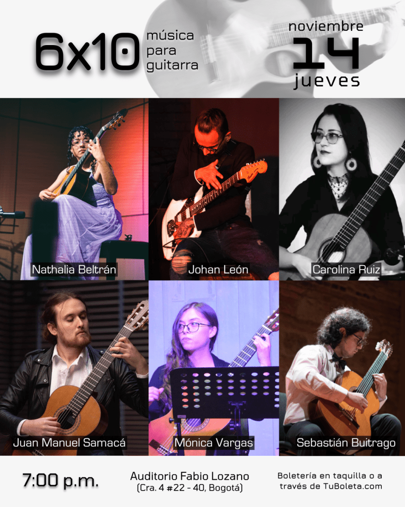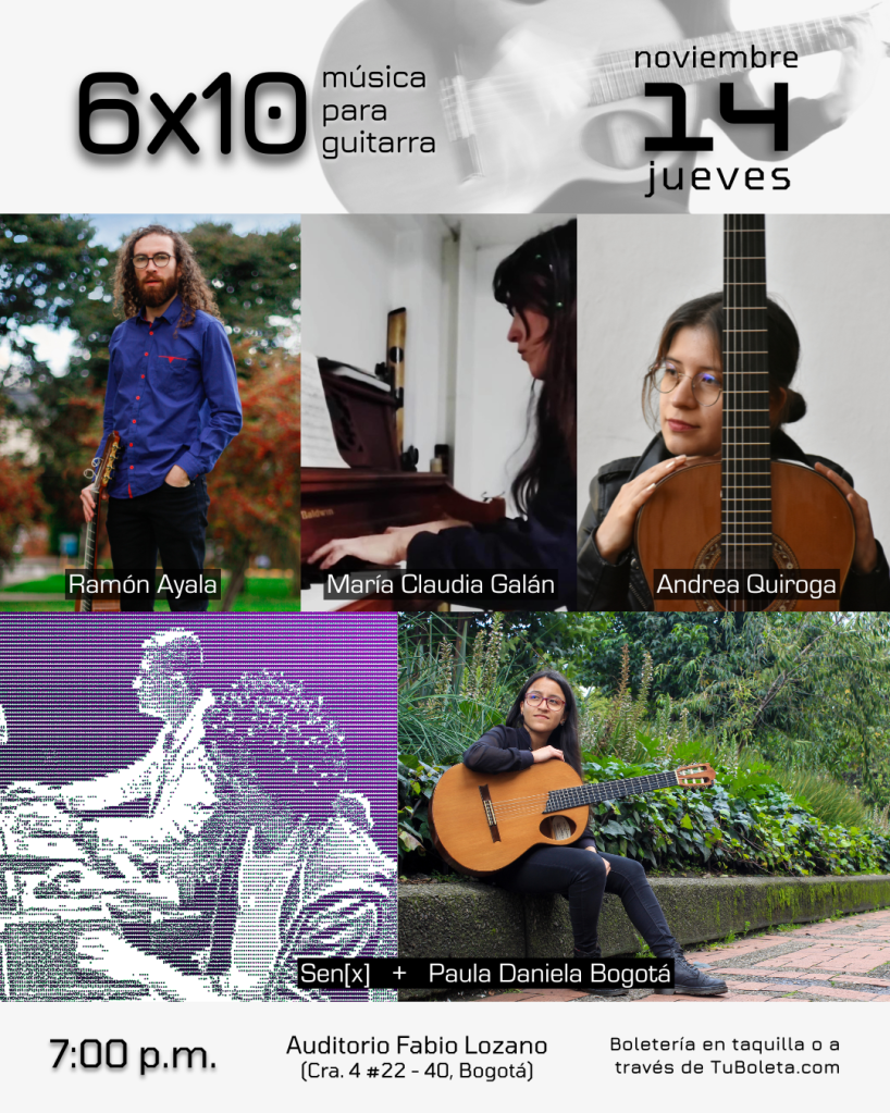 Es un concierto que trata de reunir los intereses y las propuestas musicales de lxs guitarristas bogotanxs invitadxs. Transitaremos por diversos estados del repertorio clásico del instrumento hacia la exploración de sus cualidades tímbricas e interactivas, escenarios de improvisación y experimentación.