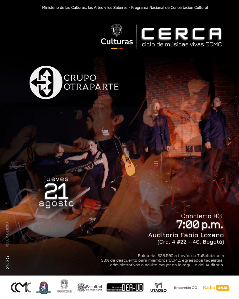 jueves 21 de agosto 7:00 p.m. Auditorio Fabio Lozano Boletería: $28.500 a través de https://tuboleta.com/es/eventos/grupo-otraparte 30% de descuento para miembros CCMC, egresados tadeístas, administrativos o adulto mayor en la taquilla del Auditorio.