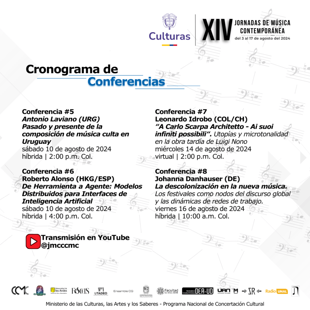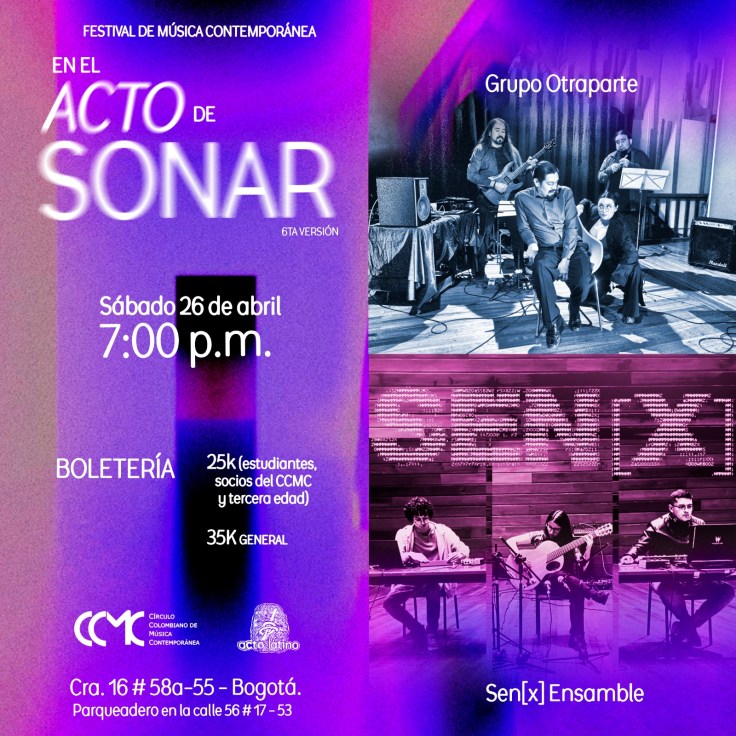 LHDR integrado por nuestro asociado Hernán Darío Guzmán y Juan David Guerrero, nos sumergirán en un potente repertorio que incluye obras de Ana María Romano, Jesús Buendía Puyo, Daniel Leguizamón y propias. Al otro lado del espectro, Sen[X] integrado por nuestra asociada Paula Daniela Bogotá y los compositores Julián Medina y Andrés Santiago Gómez, nos invitan a una inmersión profunda en el caos controlado desde la improvisación con medios electrónicos.